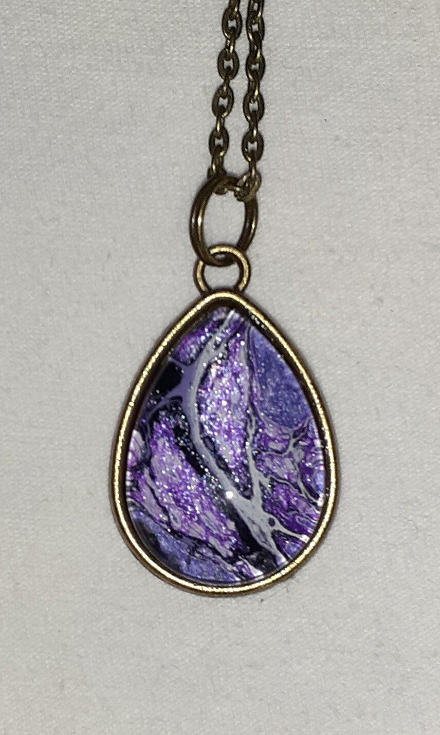 Antique gold teardrop necklace with Purples and white center
